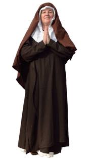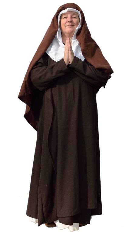 LouiseA 'mynecen' or a nun living in a convent - following the Rule of St Benedict. Dark wool dress and veil, white underdress and wimple.