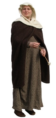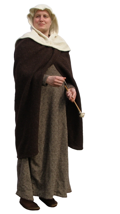 For additional warmth a cloak can be worn. These are closed at the chest by either a disc brooch or by ties. Small delicate dress brooches are also sometimes worn such as the cloisonné brooches or bird brooches. Delicate pins of bone, copper-alloy or silver were used to help secure clothing especially the head covering.