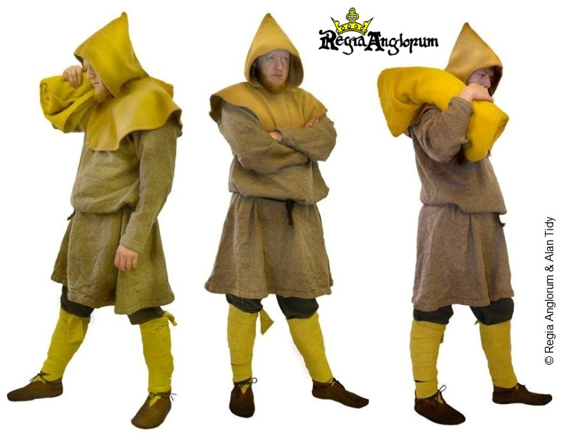 Shoes are of the simple, two-part turn shoe construction and are usually low, coming to below the ankle. Belongings can be carried in a shoulder bag of wool, linen or leather. A small drawstring pouch can be worn at the waist.