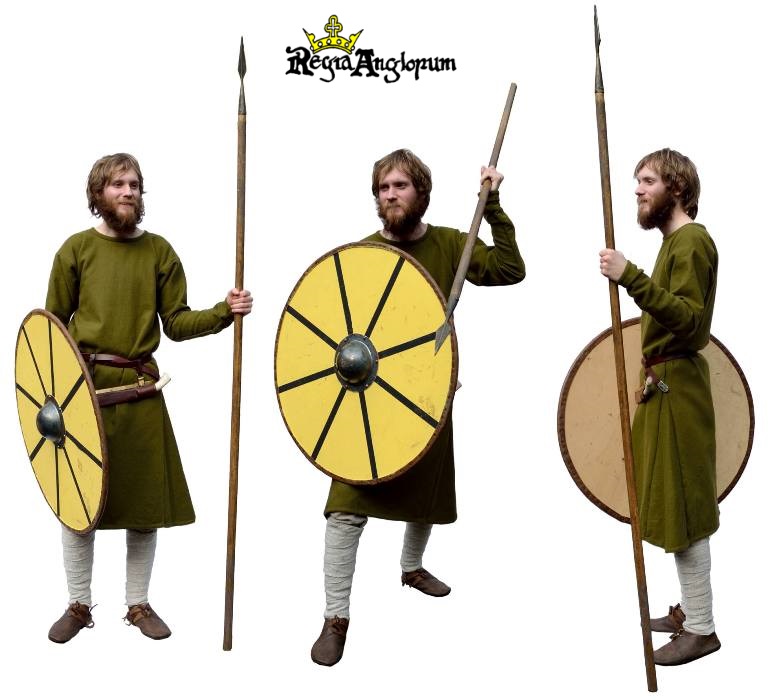 A spear is the primary weapon for all warriors throughout Regia’s period, grasped in one hand and used over-arm. A large wooden round shield is the primary form of defence, faced in leather or cloth and with an iron boss covering the centre grip. Additional weapons could include a seax, a large single edged knife; a simple non-bearded hand axe; or if they are very lucky, a sword with a tri-lobe, tea-cosy or Frankish style of pommel. Although sword styles changed noticeably these pommel types are deemed to be passable at all events.