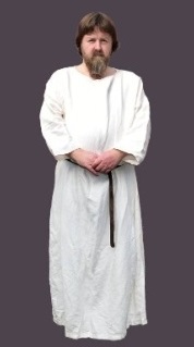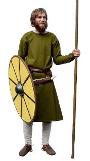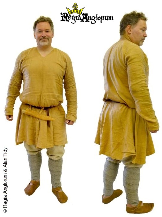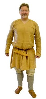 by Roland WilliamsonThis freeman wears a yellow linen shirt with a V-neck opening. In addition he carries a war-knife, known as a seax, in a sheath suspended from his belt and leg bindings around his lower legs.