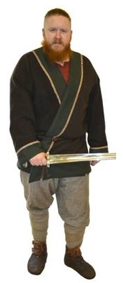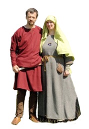 Richard and LizWearing a military lined and decorated wrap-around jacket, pinned at the hip by a ringed pin. These 'warrior jackets' are adopted from the mounted warriors from Eastern Europe. He carries a single-edged sword, typical of Norwegian Vikings.