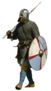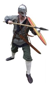 MikeA rich English warrior wearing a Coppergate style helmet and a mail shirt. He is armed with a sword, seax and spear and carries a lenticular shaped shield.