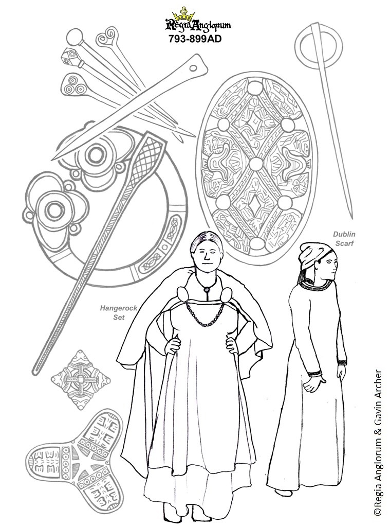 by Roland WilliamsonShe is wearing a yellow hangerock with type P37 oval brooches, gilded in gold. For warmth she has a long coat, closed by a single trefoil brooch and her hair is gathered up and covered with a simple cap.