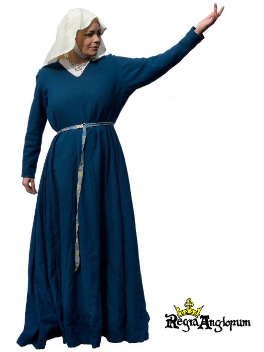 JonGown with tailored bodice, very full skirt with long hem. Magyar style sleeve shown, tight at the wrist and forearm, looser on the upper arm. Tablet woven belt with silver buckle and strap end. Annular brooch on underdress at neck. Open faced veil, with a barbette.