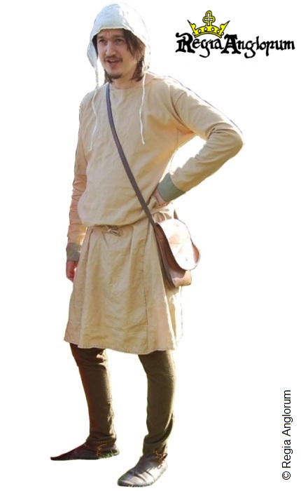 KatUndyed tunic with sleeves tight on the forearm, and small side gores, tight to the leg footed hose and turn shoes or low boots. Leather bag and coif.