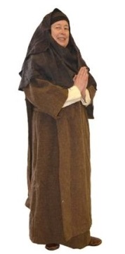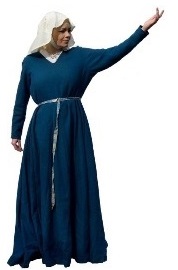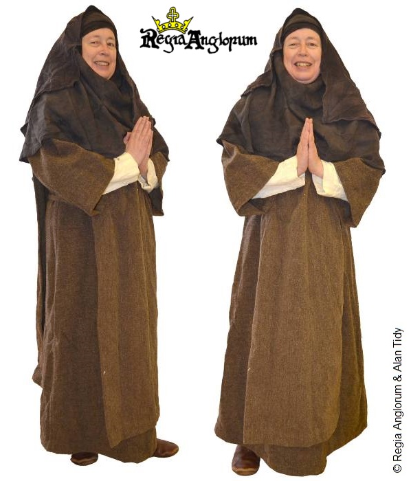 KatGown tight at the body with full skirt and Magyar sleeves and a tablet woven belt. Semi-circular cloak, tied open across the chest. Oval open faced wimple with barbette.