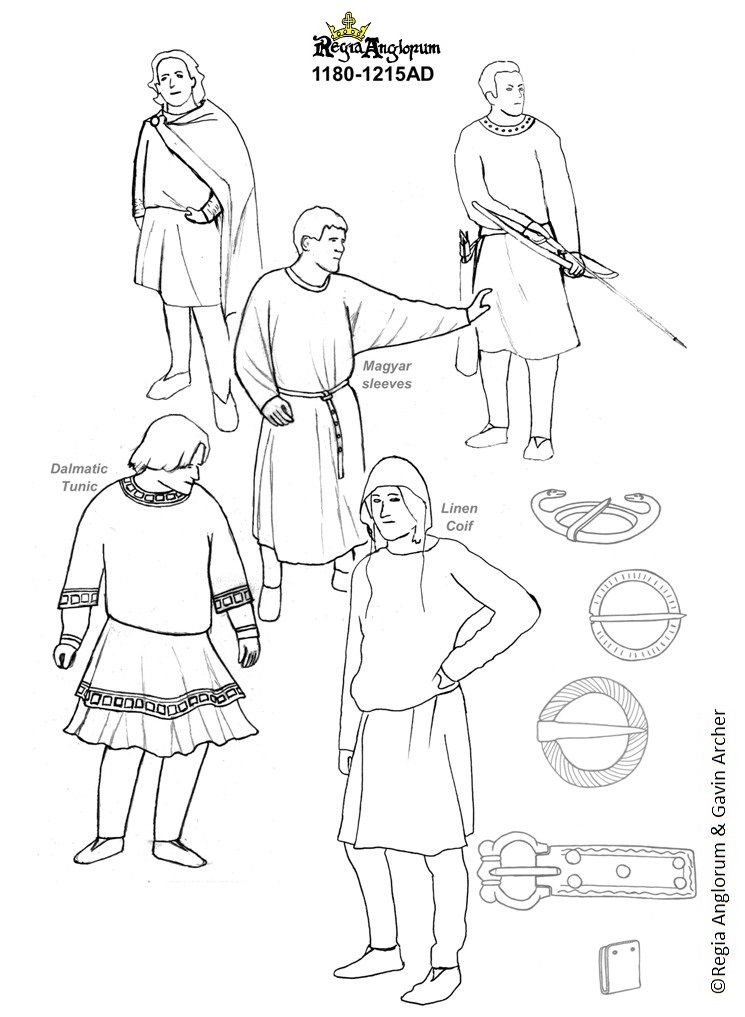 Dresses are very simple, ankle length with sleeves worn close to the wrist. Another popular style is the Magyar sleeve, which is loose at the upper arm with a wide join to the body of the dress creating a 'batwing' effect, and tight to the forearm. Rich women wear dresses with complicated tailoring, a tight bodice and a lot of fabric in the skirt. Most dresses are undecorated and dresses with loose or bliaut style sleeves would have appeared very old fashioned at this time.